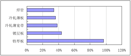 到2006年3月末,全國鋼鐵產品中,特厚板的產量增長速度最快,共生產78萬噸,增長96.8%,增加產量38萬噸。其余依次是:鍍層板(帶)272萬噸,增長43.9%,增加產量83萬噸;冷軋薄寬鋼帶271萬噸,增長38.1%,增加75萬噸;冷軋薄板237萬噸,增長36.3%,增加63萬噸;焊管462萬噸,增長34.3萬噸,增加118萬噸;電工鋼板(帶)生產79萬噸,增長34%,增加產量20萬噸;熱軋無縫管324萬噸,增長33%,增加80萬噸;熱軋薄寬鋼帶321萬噸,增長28.2%,增加產量70萬噸;棒材825萬噸,增長26.2%,增加171萬噸;厚鋼板284萬噸,增長24.8%,增加57萬噸;鋼筋1897萬噸,增長21.6%,增加337萬噸;中厚寬鋼帶1052萬噸,增長21.2%,增加184萬噸;中板520萬噸,增長19.5%,增加85萬噸;中小型型鋼638萬噸,增長17.7%,增加96萬噸;盤條1589萬噸,增長17.5%,增加236萬噸;冷軋窄鋼帶95萬噸,增長14.9%,增加12噸;熱軋窄鋼帶681萬噸,增長9.5%,增加59萬噸;大型型鋼216萬噸,增長2.9%,增加6萬噸。截止3月末,全國品種鋼材中只有熱軋薄板同比降低9.2%,產量為71萬噸,減少產量7萬噸。