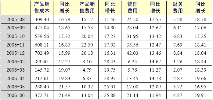 2006年1-6月,水泥制品制造業累計產品銷售成本為372.71億元,同比增長21.49%,增幅比上年同期上升了2.73個百分點;累計產品銷售費用為13.04億元,同比增長25.88%;累計管理費用為21.14億元,同比增長11.94%;累計財務費用為4.87億元,同比增長19.91%。除了財務費用增幅低于水泥制造業,其他費用增幅均高于水泥制造業,累計產品銷售成本增幅也低于水泥制造業。