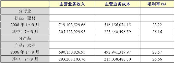 截至2006年9月30日,福建水泥股份有限公司共生產水泥252萬噸,銷售水泥248萬噸。2006年夏秋福建省在臺風、強降雨等自然災害過后,水泥需求穩步增長,市場價格基本平穩,期末開始上揚,公司水泥產、銷兩旺,單季開始盈利。7-9月產、銷為95.86萬噸和104.06萬噸,同比分別增長15.67%和22.88%。7-9月實現主營業務收入305,328,929.95元、凈利潤1,991,362.58元,同比分別增長33.09%和77.09%。2006年1~9月,公司累計實現主營業務收入719,108,529.66元,同比增長30.53%,凈利潤-29,133,304.20元,同比降低27.97%。