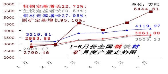 2006年二季度,全國產鋼10728萬噸,同比增長23.21%;生產生鐵10325萬噸,同比增長25.27%;生產鋼材11993萬噸,同比增長32.39%;生產鐵原礦14262萬噸,同比增長40.25%。增長速度表明:今年前6個月,全國鋼、鐵、材、礦的產量持續快速增長,6月當月日產量分別達到122萬噸、117萬噸、137噸和181萬噸;日產量分別比去年同期增加19萬噸、21萬噸、33噸和58萬噸,持續迭創歷史日產新高。按1-6月份平均月產量,考慮最新日產量增長水平,預測2006年全國鋼、鐵、材、礦的產量將分別達到4.1億噸、4億噸、4.6億噸、5.7億噸。從各產量增長速度看:今年以來粗鋼定基增長22.72%,生鐵定基增長20.53%,鋼材定基增長27.95%,鐵原礦定基增長95.16%;由于統計方面的因素,單從礦-鐵-鋼-材的生產工藝流程比例,已經很難判斷各產量及增長速度之間的協調性,但從鐵原礦產量幾乎成倍增長的情況看,今年以來行業規模擴張速度依然十分迅猛。