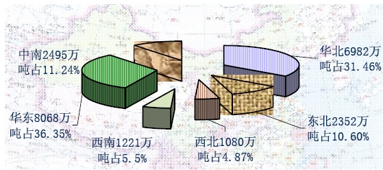 在全國19947萬噸粗鋼產量中:華北地區生產7073萬噸(占全國總量35.46%)、東北2250萬噸(占全國總量11.28%)、西北1037萬噸(占5.2%)、西南1228萬噸(占6.16%)、華東6270萬噸(占31.43%)、中南2089萬噸(占10.47%)。在22195萬噸鋼材中:華北地區生產6982萬噸(占全國總量31.46%)、東北2352萬噸(占全國總量10.60%)、西北1080萬噸(占4.87%)、西南1221萬噸(占5.5%)、中南2495萬噸(占11.24%)、華東8068萬噸(占36.35%)。