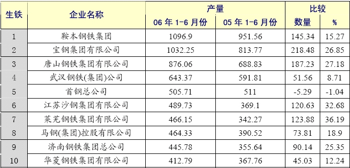 2006年6月累計生鐵產(chǎn)量前十五家企業(yè)生產(chǎn)情況
