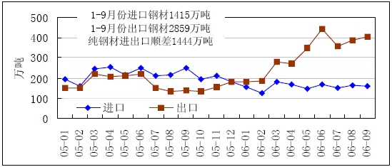 2005年1月-2006年9月全國(guó)鋼材進(jìn)出口逐月走勢(shì)