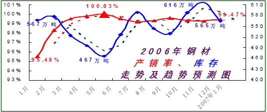 2006年鋼材產銷率、庫存走勢及趨勢預測