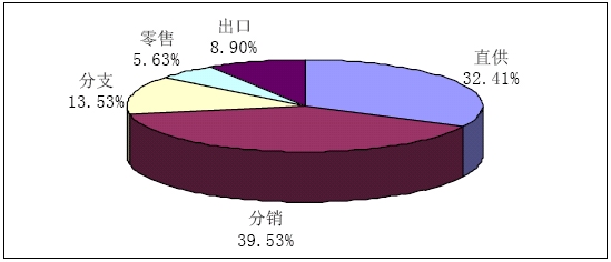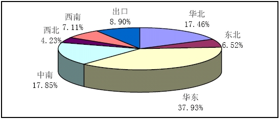 2006年,在重點(diǎn)統(tǒng)計(jì)單位中屬于企業(yè)直供銷售的鋼材有9095萬(wàn)噸,占總銷量的32.41%;分銷11092萬(wàn)噸,占總銷量的39.53%;分支機(jī)構(gòu)銷售3797萬(wàn)噸,占總銷的13.53%;零售1580萬(wàn)噸,占總銷量的5.63%;出口2499萬(wàn)噸,占總銷量的8.9%。2006年,全國(guó)重點(diǎn)統(tǒng)計(jì)單位鋼材產(chǎn)品的地區(qū)流向主要是:華北地區(qū)4900萬(wàn)噸、華東地區(qū)10644萬(wàn)噸、中南地區(qū)5009萬(wàn)噸,以上三大地區(qū)總銷量為20553萬(wàn)噸,占銷售總量的73.24%。其余依次是西南地區(qū)1996萬(wàn)噸(占7.11%)、東北地區(qū)1829萬(wàn)噸(占6.52%)。銷售數(shù)量最少的地區(qū)是西北地區(qū)1188萬(wàn)噸,僅占總銷量的4.23%。