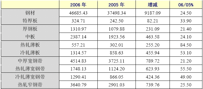 從全國的鋼材產品結構看,2006年長材和板帶材產量分別為22462.4萬噸和19504.5萬噸,分別同比增長19.6%和31.6%,占國內總產量的48.1%和41.8%。從產量增長幅度看,板帶材產量增速要高于長材產量增速。另外管材產量達到3493.0萬噸,增長20.8%,占鋼材產量的7.5%,國內板管比已經達到49.3%。