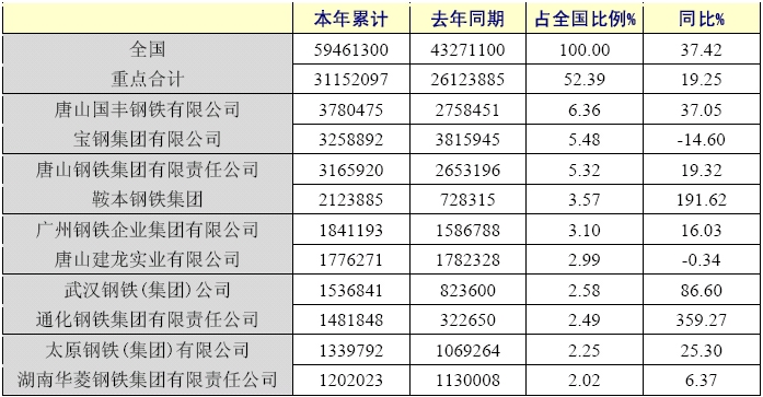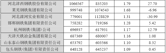 2006年,我國熱軋薄板帶產量5946.13萬噸,同比增長37.42%,重點統計單位產量只有3115.21萬噸,同比增長19.25%,占全國產量的52.39%,產品的生產集中度較低。從分品種看,重點統計企業的熱軋薄寬帶鋼產量占全國產量的69.73%,所占比例有所下降,而熱軋窄帶和熱軋薄板的產量較低。產量最大是唐山國豐,其產量占全國總量的6.36%,寶鋼產量占5.48%,唐鋼占5.32%。