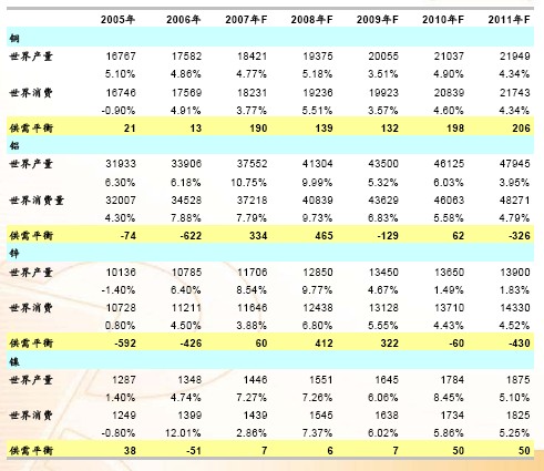07年銅、鋁、鋅和鎳金屬需求增速均有所放緩。銅金屬供需過剩數量將有所擴大;而鋁、鋅和鎳金屬均由06年的供需缺口轉為供需少量過剩。但相對于銅、鋁和鋅金屬上千萬噸的消費量而言,小量的過剩還遠不足以全面地說明供需領域出現了問題。