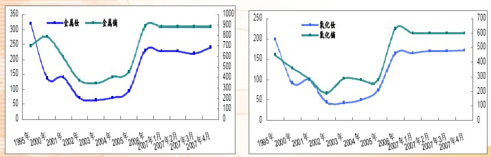 07年以來,各類稀土價格維持在行業復蘇以來的高位,氧化釹和金屬釹價格4月甚至出現小幅度上升,分別達到17.2萬元/噸和24萬元/噸。基于國家對我國稀土行業的宏觀調控力度將進一步加大,我國稀土行業值得長期看好。