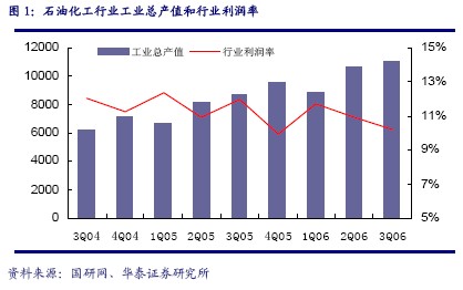 2006 年前三季度,石油化工行業(yè)作為我國宏觀經(jīng)濟(jì)的基礎(chǔ)和支柱產(chǎn)業(yè),繼續(xù)在自身的發(fā)展慣性作用下保持穩(wěn)定增長,但其增長速度相對于2004-2005 年高速增長期已經(jīng)有所回落。石化行業(yè)工業(yè)總產(chǎn)值已經(jīng)連續(xù)兩個(gè)季度突破萬億元大關(guān),但需要關(guān)注的是,行業(yè)利潤率在波動(dòng)中已經(jīng)開始出現(xiàn)了下滑的趨勢,預(yù)計(jì)今年石化行業(yè)的行業(yè)利潤率在10.5%左右,相比于去年的11.3%下降近一個(gè)百分點(diǎn)。這一利潤率指標(biāo)的走向直接反映了石油化工行業(yè)在經(jīng)歷了近期高峰以后,開始進(jìn)入景氣回落周期。