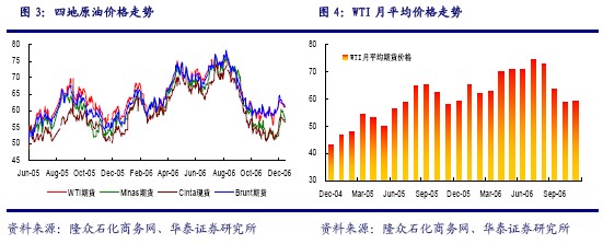 到06年12 月為止,原油價格雖然也一度出現了小幅的回升,但并未如之前外界所預料的那樣再度強勁回升到65 美元/桶以上的臺階,而且到12月紐約市場原油期貨價格最低曾收在55.8 美元/桶,這已經是17 個月以來的最低點。這一方面與今年冬天北半球氣溫較暖有關,但主要的還是國際地緣政治、操作資金退出等各方面因素以及由此而生的預期因素共同作用的結果。