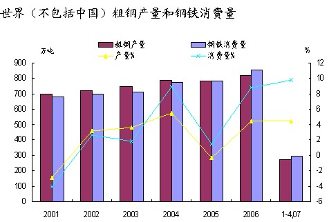 統計顯示,2007年1-4月,世界除中國外鋼鐵消費量增長9.8%(2006年8.3%),而粗鋼產量增長僅4.4%(2006年4.4%) ,但是近年國際市場鋼材價格上漲沒有并能導致其它國家鋼產量大增,相反中國成為滿足全球鋼鐵需求增長的主要力量,可見,除非有大量新建產能可以替代中國,或國際鋼鐵需求下降,中國鋼鐵出口將維持高位。