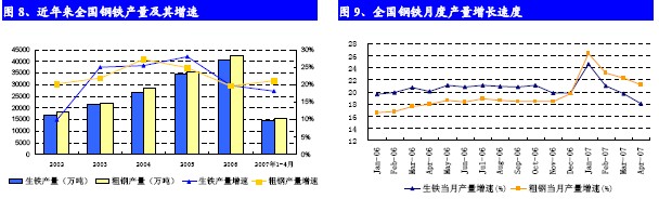 2007年1-4月,全國生鐵產量為14633萬噸,同比增長18.1%,粗鋼產量為15509萬噸,同比增長21.2%,繼續保持快速增長勢頭。