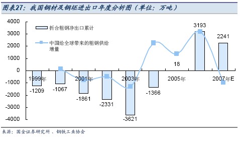 如果單看當年的鋼材及鋼坯凈出口量,2006 年的凈出口3193 萬噸創歷史新高。而如果以前一年為參照,看增量,也就是中國給全球帶來的粗鋼供給增量來看,2004-2006 年中國每年給世界增加了2255、1384、3193 萬噸的增量,而2007 年的供給增量為-952 萬噸。顯然不是我們所想象的給全球的供給帶來巨大的沖擊,以此角度分析,2007 年我們給全球的鋼鐵市場沖擊并不嚴重。