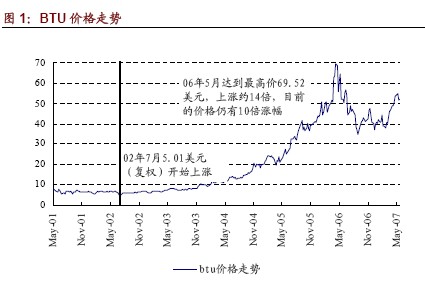 BTU,于2001 年5 月22 日上市,自02 年7 月的5.01 美元(復權價)開始上漲,
