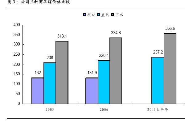 從上表我們可以分析得出以下結論:1、在長約合同中坑口煤的比重在不斷下降,07 年上半年坑口煤基本沒有長期合約,只有現貨市場銷售。2、下水煤與直達煤都在增長,下水煤的增長速度快于直達煤,下水煤在總煤炭銷售中的比重不斷提高。3、相對與現貨市場表現,長約合同煤有較大的提價空間。