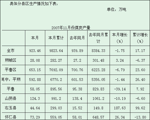 從1-11月份煤炭產銷情況來看,全市煤炭的增長幅度比上月略有下降。2007年,朔州煤炭市場運行平穩,產銷保持穩定增長。