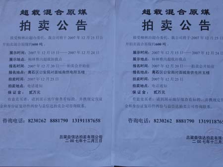 柳林縣雅溝治超點所卸超載原煤拍賣公告