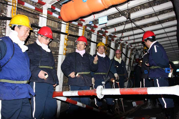 曹榮平一行一到臨渙礦就來到更衣室,在該礦黨政領導的陪同下,深入井下慰問節日期間堅守崗位的臨渙礦職工。曹榮平一進罐籠看到不銹鋼罐壁、環境衛生、人性化扶手,高興地說,從細微處就能看出臨渙礦標準化工作在不斷的發生變化。當曹榮平置身于臨渙礦井底大巷,看到延綿不斷的壁畫時,感到耳目一新。他說,人要改變環境,反過來環境就能塑造人,這也是臨渙礦質量標準化工作上品位、上檔次的表現。臨渙礦井底車場處處都有人性化手筆,明顯的標識、標志、反光提醒牌、橫跨軌道的警示條,處處彰顯著人性化管理。認為臨渙礦在質量標準化創建中,真正動了腦筋、下了功夫。每到一處,曹榮平在肯定臨渙礦安全質量標準化創建取得成績的同時,也就存在的問題提出了指導性意見。隨后,曹榮平一行又乘車來到東三采區掘進三區施工的931風巷,看望慰問那里堅守崗位的職工。掘進三區施工的140余米巷道一路燈火通明,環境衛生、各類安全設施齊全可靠,在接近迎頭時,迎面的是掘進三區職工井下休息室,曹榮平步入室內看到鮮花盛開、牌板齊全、溫馨的安全提示、幽雅的休息環境,真正體現出對職工的關懷。曹榮平關切地詢問著當班職工安全生產情況,在捕車器旁,他要求隨行的臨渙礦領導,結合實際制定好“兩節”期間的具體工作安排,統籌好安全與生產、安全與其它各項工作的關系,加強領導,精心組織,明確任務,落實責任。把“兩節”期間的安全工作與貫徹落實集團公司工作會議與安全工作會議精神結合起來,使“兩節”期間的安全工作井然有序。加強管理人員帶班制度,嚴禁空班、漏班。在931掘進頭,曹榮平認真檢查了工程質量,他說今年臨渙礦申報了質量標準化示范礦井,我持有疑問,沒想到通過一路的檢查、走看,臨渙礦安全質量標準化發生了這么大的變化,有許多做法在全公司值得推廣學習。我礦領導韓流、楊軍、朱世奎、周曙光等陪同曹榮平一行到井下慰問。