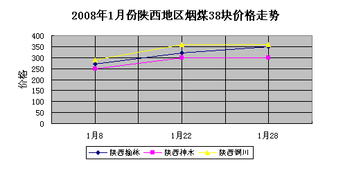 2008年1月份陜西地區(qū)煙煤38塊價(jià)格走勢(shì)整體呈上升趨勢(shì)。月初至月底整體攀幅50-90元/噸左右。由圖表看出,上半月整體漲勢(shì)較快,,攀幅在50元/噸左右。下半月整體漲勢(shì)趨緩。陜西銅川地區(qū)出礦含稅價(jià)格較高,由月初的290元/噸上漲至月底的360-380元/噸。攀幅為70-90元/噸。