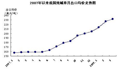 據海關統計,2008年1季度我國累計出口純堿46.7萬噸,價值1億美元,比去年同期(下同)分別增長4.1%和47.5%,出口平均價格為224.5美元/噸,同比上漲41.7%。其出口主要特點是:
