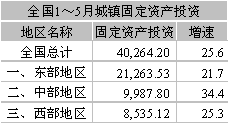 今年1~5月份,全國城鎮固定資產投資40,264.20億元,同比增長25.6%,其中房地產投資9,519.28億元,同比增長31.90%。