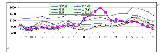 A、純苯、甲苯、二甲苯:油價、外盤反復互動調低,同時市場需求頹勢加劇,導致9月份國內市場人氣低迷,尤其商家和下游廠家的購買信心低落,市場彌漫著濃郁的觀望情緒,加上長假逼近,抑制了市場的購買放大,價格繼續(xù)進入陰跌通道,其中純苯因需求疲弱和前期價格高挺而跌幅大,在700-800元/噸;其次二甲苯、甲苯降幅在500-600元/噸。9月份化工銷售廣州分公司茂名石化甲苯、純苯外銷價格共計上調3次,幅度分別為950/300元/噸;二甲苯外銷價格共計下調1次,幅度為200元/噸。