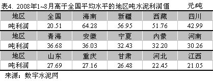 去年1~8月噸水泥利潤(rùn)超過(guò)當(dāng)時(shí)全國(guó)平均值14.37元的地區(qū)有11個(gè)省區(qū),而今年同期噸水泥利潤(rùn)超過(guò)該值的有21個(gè)省(市)區(qū)。今年1~8月噸水泥利潤(rùn)全國(guó)平均值也越升至20.51元,超過(guò)平均值的地區(qū)達(dá)到14個(gè)省(市)區(qū)(見(jiàn)表4)。因此,雖然總體上需求形勢(shì)仍不容樂(lè)觀,但企業(yè)的盈利水平卻超出預(yù)期。
