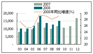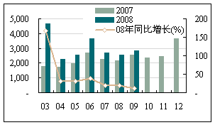 從投資狀況來看,除了內蒙古、上海、山東外,其他各地區的固定資產投資環比增長率基本恢復正增長:奧運會禁止施工的后續影響在逐步消除,北京及周邊各地區正處于逐步恢復的狀態;山東省始終沒有改變其環比增速的負增長狀態:-17.48%(7月)、-25.23%(8月)、-18.17%(9月),累計完成額為9593.56億元,同比增長22.30%,占全國比重9.61%,居首位。