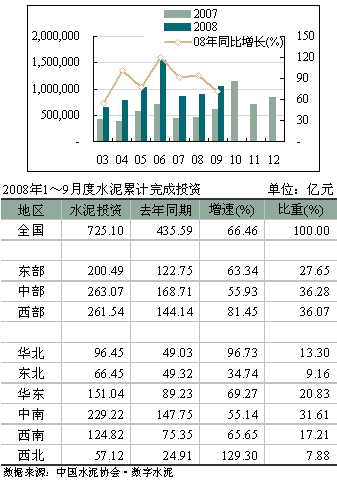 9月份,水泥投資完成額為1,045,710萬元,較8月份增長17.17%,與去年同期相比增長71.41%,下降近23個百分點。