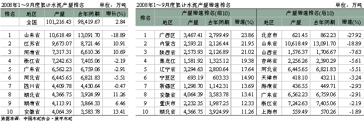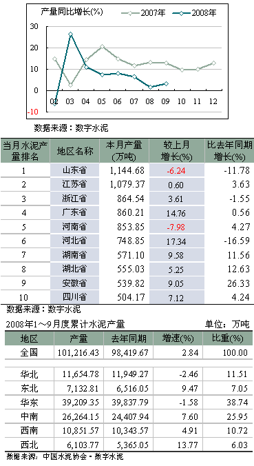 1~9月份水泥累計產量同比增長2.84%,為10.12億噸。就區域分布狀況來看,華東、中南水泥產量與投資相吻合,占較大比重,分別為38.74%和25.95%,但華東地區同比增速下降1.58%。