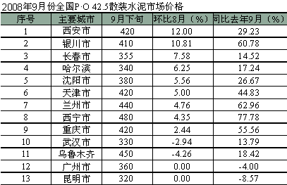 9月份的水泥價格絕大部分省市保持穩定。全國31個省會城市中,有9個城市的水泥價格出現上漲,其中上漲幅度較大的是陜西,上漲了45元;寧夏上漲了40元,市場需求的拉動和原材料價格的上升成為價格上漲的主要推動因素。