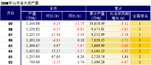 山東省一直是全國水泥的產量大省,但自今年年初以來受國際、國內經濟影響,以及山東省建設的緩慢,山東省的水泥產量增速放緩,累計產量同比增長速度自4月份開始處于“滑鐵盧”,甚至出現負增長。