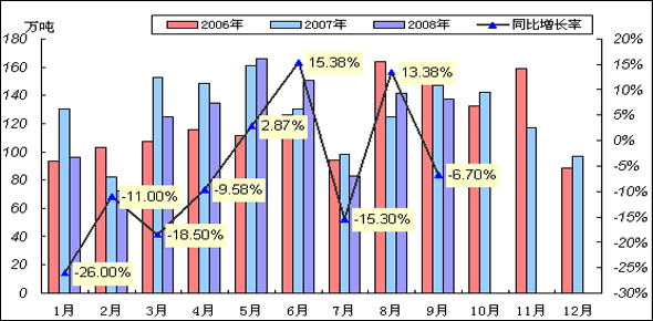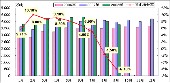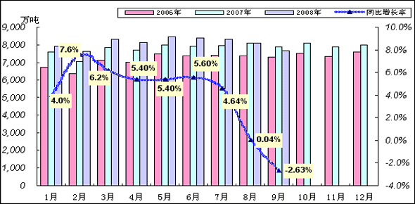 圖一 2006-2008年全球生鐵月產(chǎn)量對比走勢圖