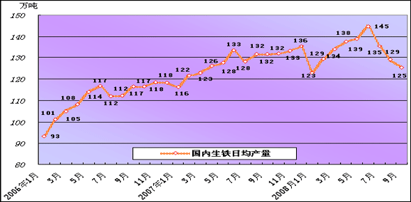 『國內(nèi)方面』2008年9月,中國生鐵產(chǎn)量較8月份有所下降,日均產(chǎn)量也出現(xiàn)回落。根據(jù)國家統(tǒng)計局統(tǒng)計的數(shù)據(jù)顯示:2008年9月,全國生鐵產(chǎn)量共計3754.95萬噸,比8月份減少了249.59萬噸,與去年同期相比產(chǎn)量減少了196.33萬噸,降幅6.1%。1-9月累計生產(chǎn)生鐵36673.52萬噸,同比累計增幅5.1%。9月份中國生鐵日均產(chǎn)量為125.2萬噸,較8月份的129.18萬噸略減少3.98萬噸。參考圖三、圖四。