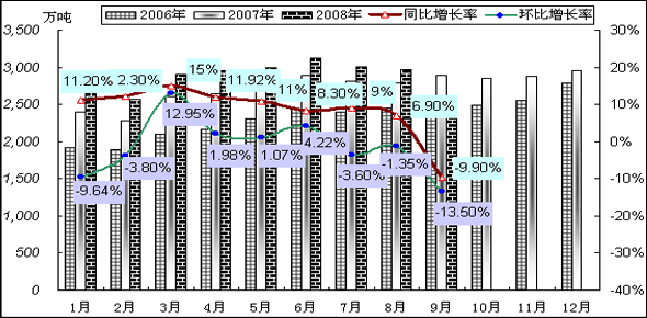 表一 2008年9月份焦炭產(chǎn)量及環(huán)比增長率