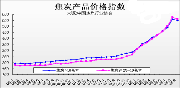 根據(jù)中國煉焦行業(yè)協(xié)會和冶金價格信息中心發(fā)布的中國焦化產(chǎn)品價格指數(shù)顯示,2008年1-9月,國內(nèi)焦炭市場價格指數(shù)快速走高,9月份焦炭產(chǎn)品(>40毫米)指數(shù)回落至548.82,與7月份相比上漲了11.22點。參考圖十。