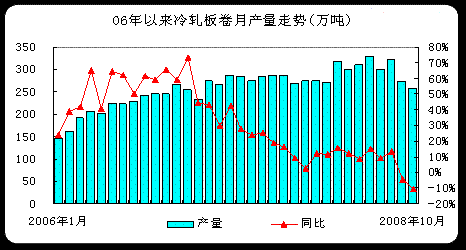 近幾個月來,冷軋板卷主要下游行業(yè)產銷形勢不佳,對原材料需求不斷下降,同時代理商因行情不斷下挫則主動縮減訂貨量,使得鋼廠合同組織困難,庫存不斷上升。再者,大中型鋼廠原材料庫存充足,成本也比較高,虧損面不斷擴大。受上述因素的影響,鋼廠相繼采取限產行動,產量隨之持續(xù)下降。