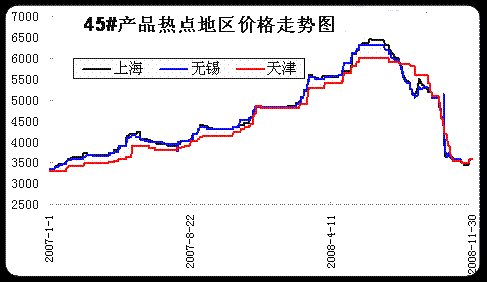 圖:2007年1月-2008年11月熱點地區(qū)45#碳結(jié)鋼價格走勢圖