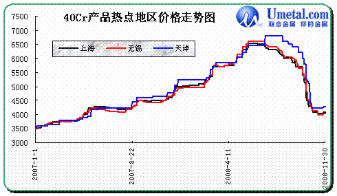 圖:2007年1月-2008年11月熱點地區(qū)40Cr合結(jié)鋼價格走勢圖