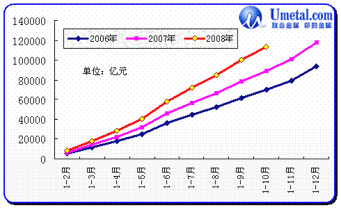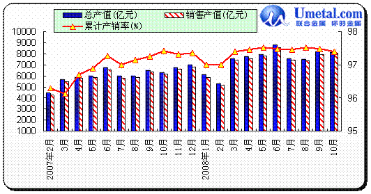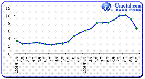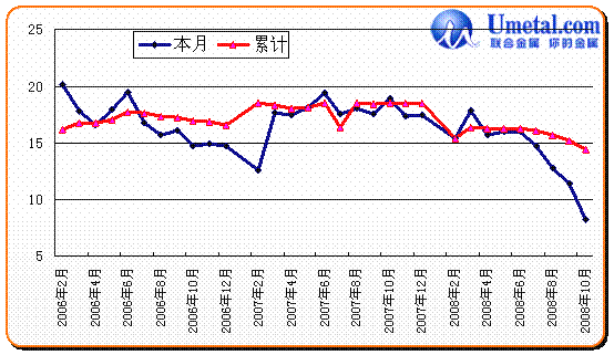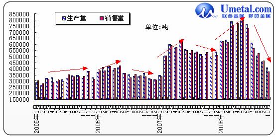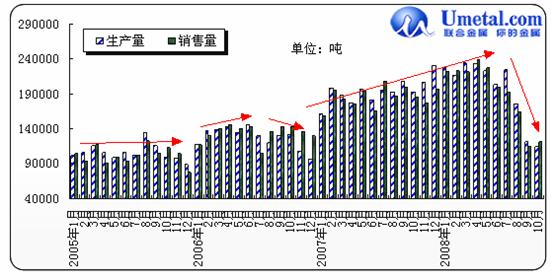 從上圖中,我們可以看出,10月份國內(nèi)碳結(jié)鋼產(chǎn)量、銷量繼續(xù)縮減,已經(jīng)達(dá)到2006年同期水平,這也在一定程度上說明市場需求極度萎縮,而鋼廠方面也繼續(xù)大幅減產(chǎn)甚至停產(chǎn)。
