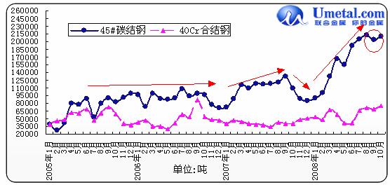 從上圖3、4中,我們可以看出,10月份國內(nèi)碳結(jié)鋼產(chǎn)量、銷量繼續(xù)縮減,已經(jīng)達(dá)到2006年同期水平,這也在一定程度上說明市場需求極度萎縮,而鋼廠方面也繼續(xù)大幅減產(chǎn)甚至停產(chǎn)。而在11月份部分停產(chǎn)、減產(chǎn)的優(yōu)鋼企業(yè)并沒有復(fù)產(chǎn)。鋼廠長期的停產(chǎn)、減產(chǎn)在一定程度上也使得市場資源供給方面出現(xiàn)短缺。據(jù)聯(lián)合金屬網(wǎng)了解,在12月份,首特、武鋼將對部分優(yōu)鋼產(chǎn)品復(fù)產(chǎn),這樣可能對市場資源緊張的局面起到一定的緩解。