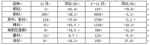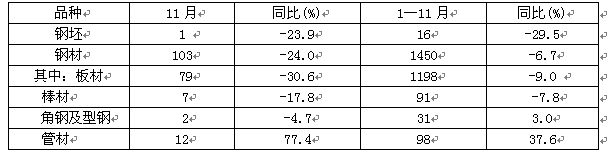 進口小幅下降。據海關統計,11月份全國進口鋼材103萬噸,環比下降10.4%,同比下降24%;進口鋼坯1萬噸,同比下降23.9%。今年1—11月份累計,進口鋼材1450萬噸,比去年同期下降6.7%。