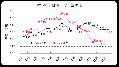 今年年初,鋼鐵生產所需原燃料價格不斷上升,鋼材各品種內需旺盛、出口勢頭不錯,粗鋼、鋼材產量得以持續穩步增加,粗鋼日均產量在6月達到156萬噸,相當于5.7億噸年產量。之后,為了兌現綠色奧運這一莊嚴承諾,華北六省市部分鋼鐵企業在奧運召開前夕選擇為奧運讓路,主動停限產,再加上需求受到傳統淡季及高價位的雙重制約,三季度粗鋼產量呈現下降趨勢。原本以為鋼廠產量會隨著“金九銀十”這一傳統旺季到來而再度走高,但市場行情下挫態勢毫無止跌之意,發端于美國的次貸危機很快轉化為全球性金融危機,價格加速回落,而鋼廠原料庫存成本居高不下,不得不相繼宣布停產或限產,10月粗鋼日均產量隨即降至06年下半年以來最低水平。