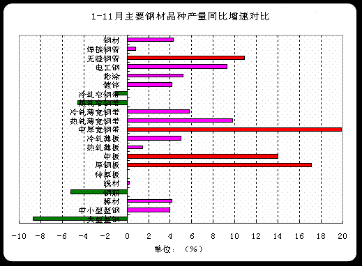 在鋼材總產量增速回落的大背景下,鑒于鋼鐵生產企業力爭進一步優化產品結構,新建項目基本為板材項目和管材,各鋼材品種產量由此出現分化,前11個月長材累計產量低于去年同期,出現負增長,板帶材增速則較鋼材總產量增速高出近7個百分點。具體到各品種,中厚寬鋼帶增速最快,接近20%,厚鋼板和中厚板產量增速也不錯,約為14-17%,接下來便是無縫管和熱軋薄寬鋼帶,相比之下,大中型材、螺紋以及熱軋窄帶產量則呈負增長,同比下降5-9個百分點。