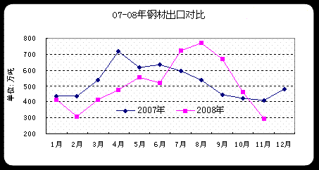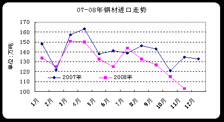 與國內外市場價格走勢相一致的是,今年我國鋼材出口呈先增后降態勢,4季度降幅最為明顯。今年上半年,國際經濟形勢尚好,需求較為旺盛,再加上國內外價差較大,買賣雙方商家積極性都很高,鋼材出口量持續上升,單月出口量在8月達到768萬噸的歷史最高水平。在此之后,金融海嘯悄然來襲,實體經濟相繼受到沖擊,需求急轉直下,鋼材出口量快速下降,11月份降至300萬噸以來,為2006年下半年來最低水平。預計全年出口量不足6000萬噸。