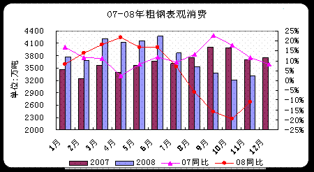 奧運會的成功召開的背后是各行業默默支持,其中便包括鋼鐵行業,為支持奧運,華北六省市部分鋼企在7、8月主動停限產。就在奧運結束不久,宏觀經濟面急轉直下,從根本上抑制了國內產能釋放和市場消化能力。受此影響,今年以來粗鋼表觀消費量增速大幅回落,前11個月表觀消費同比增速較去年同期回落近7個百分點,其中8-11月連續4個月呈負增長態勢。