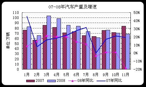 今年汽車行業日子并不好過,上半年受原燃料價格不斷上漲的困擾,下半年后期又深受金融危機的沖擊,產銷狀況不理想,全年產銷實現1000萬輛的夢想宣告破滅。1-11月我國汽車累計產銷870.40萬輛和862.98萬輛,同比增長7.98%和8.52%,分別比07年同期回落14.27個百分點和14.67個百分點,汽車銷量同比增幅自2005年7月以來首次低于10%。很顯然,與前幾年中國汽車市場高速增長相比,增速有所放緩,在外部環境持續惡化和國內消費萎縮等因素影響,中國汽車產銷增速放緩十分明顯,中國汽車市場在經歷了多年的持續增長后進入新一輪調整期。