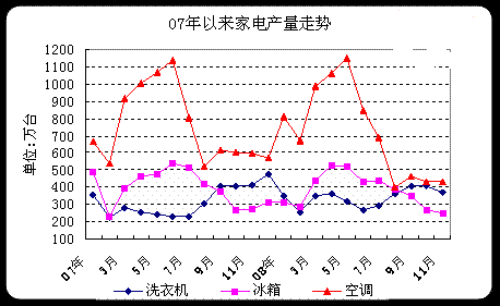 由于內需外需同步萎縮,家電產量增速持續回落,其中空調產量連續6個月呈現負增長,出口量值同時明顯下滑。最新統計數據顯示,11月家用洗衣機、冰箱和空調產量同比均出現負增長,降幅分別為10.7%、4.9%和23%,1-11月洗衣機累計產量同比增加約11個百分點,冰箱產量同比增加3%,同期空調產量則下降2.8%。