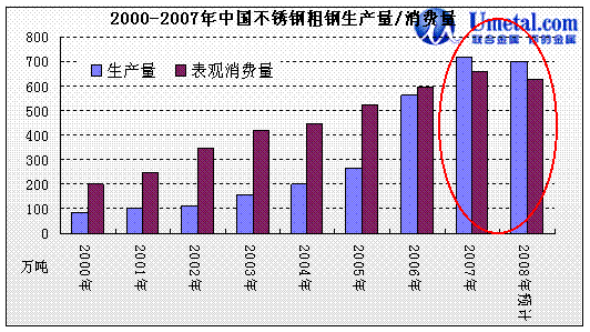 圖1、2000-2007年中國不銹鋼粗鋼產(chǎn)量和消費量情況